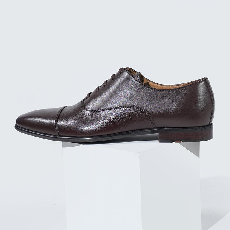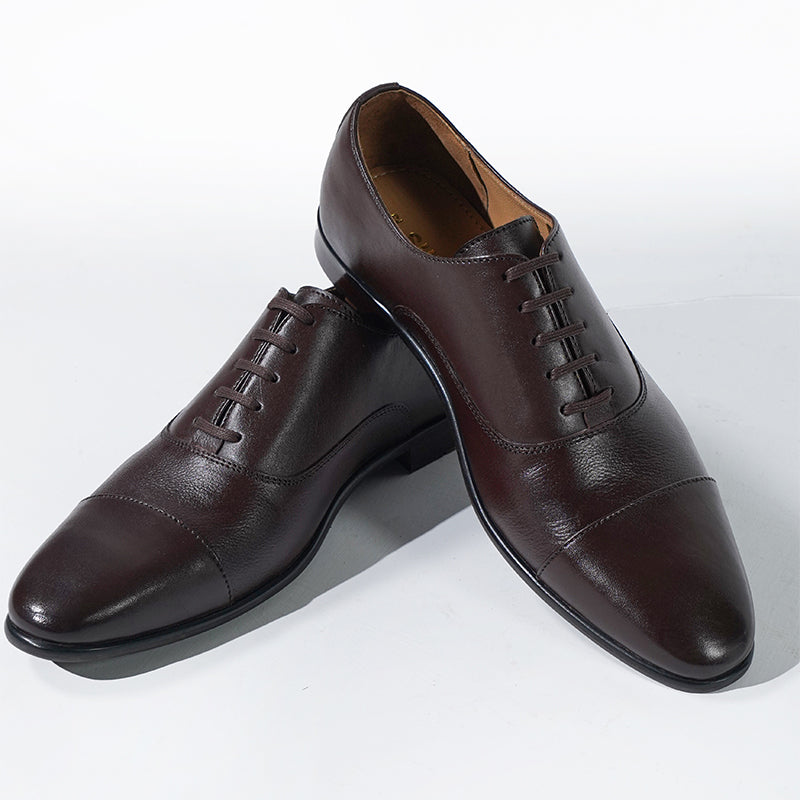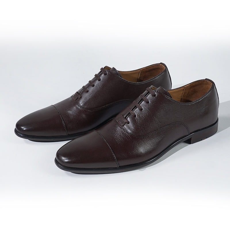 These are formal oxford shoes with a sleek design, characterized by their closed lacing system and cap-toe detail. The shoes are crafted from brown leather with a polished finish, offering a sophisticated and classic look suitable for business or formal occasions.